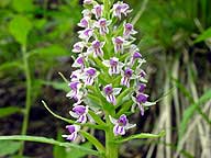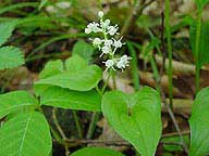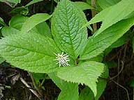 ちなみに、ぼくらが脱落するまでにガイドさんから説明してもらった植物は、枝の内部が空洞なのでウツギ(空木)という名の付いたタニウツギ、同じくヒメウツギ、食用にする胡桃で長い花穂を垂れているオニグルミ、渓流沿いの斜面で水平に張った枝一面に白い花を咲かせているミズキ、白い小さな花を円錐形に積み上げたように咲いている実がとち餅の材料となるトチノキ、山地に咲く可憐なランの仲間ノビネチドリ、葉の真ん中に緑色の小さな花が咲くハナイカダ(写真は雄花)、穂が狸の尻尾に似ているというので名前が付いたタヌキラン、こいのぼりの矢車に似た大きな葉のヤグルマソウ、雉の筵の意味だという黄色い花のキジムシロ、美しい白い花序を静御前にたとえたヒトリシズカ、小型のシャガで薄紫の花が美しいヒメシャガ、淡い紫色の花は比較的地味なニシキゴロモ、ちいさめの白い花が二つ並んで咲くニリンソウ、背が高い大型のスミレで薄紫の花がきれいなオオタチツボスミレ、草餅にするとヨモギよりおいしいというオオヨモギなどでした。(ガイドさんがこのように説明したということではありません。)