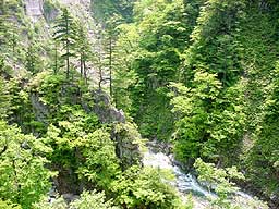 中宮展示館から姥ヶ滝駐車場までコースの距離は5キロほどで、しりたか滝、赤石の滝、岩底の滝、かもしかの滝、姥ヶ滝という五つの滝と蛇谷大橋(一番上の写真)があり、道は緩やかな登りになっていて、車でサーっと通ってしまってはもったいない、ゆっくり歩いて景色を楽しむのにもっとも適した区間です。