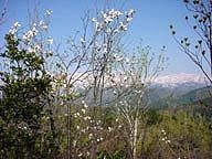 初夏の日差しに首筋を焼かれ汗を流して尾根に上がってみると、葉の出る前に白い花をたくさんつけたタムシバなどが邪魔をして白山はよく見えません。